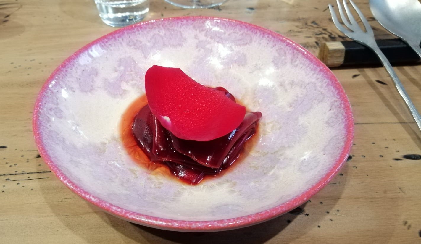 Remolacha confitada con pétalo de rosa y vinagre de rosa ….
