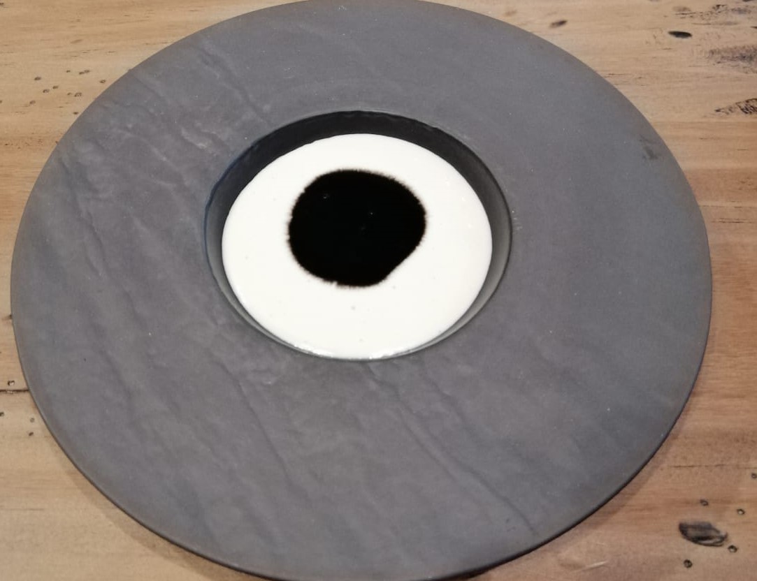 El debate llega a su punto álgido con un pase que se sitúa a medio camino entre la cocina salada y el mundo de los postres: chocolate y jamón. Sobre el fondo del plato encontramos una deliciosa crema de la grasa del puerco que encajaría a la perfección como snack de bienvenida en cualquier restaurante de corte clásico tipo asador. Nuevamente sublime la textura que se consigue y que, despojada totalmente de su carácter graso, acaricia suavemente el paladar sin provocar esos matices amargos que frecuentemente nos deja la grasa de jamón. Pero el juego, la provocación y, a la par, esos toques amargos que no echábamos de menos, nos los aporta la bola de cacao que descansa sobre la crema. Raro, raro.