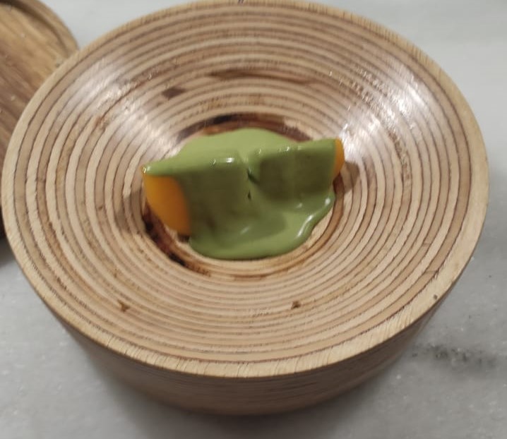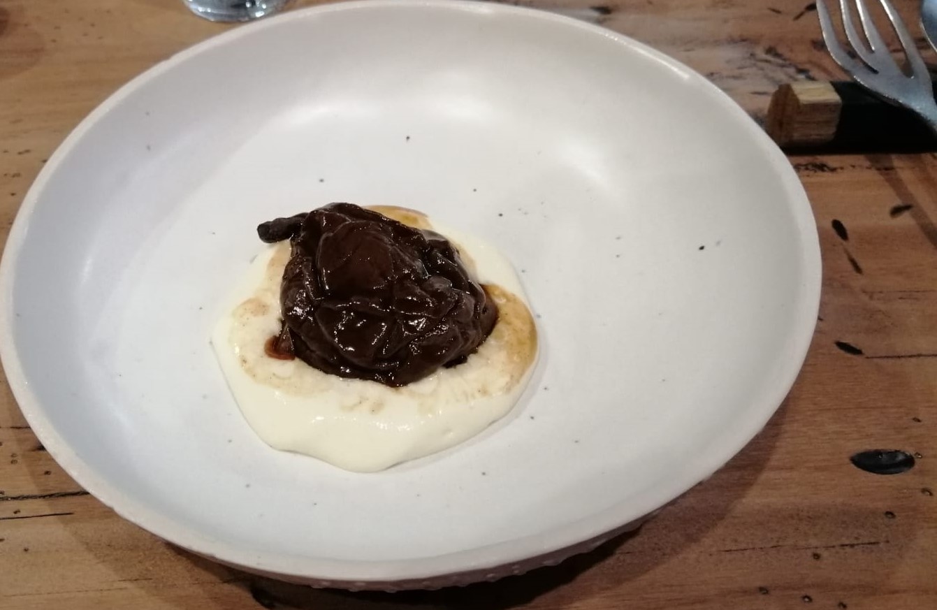 Un tanto más convencional nos resulta el pan, aceite y chocolate. Sobre una especie de crumble de pan y chocolate luce una generosa quenelle de helado de aceite de oliva cargada de simbolismo ya que en ella queda patente el producto jienense más universal. El conjunto se remata con una rodaja de mandarina liofilizada a modo de eslabón último de una cadena que se cierra en bucle ya que que justamente comenzamos nuestro menú con este mismo producto. Mucho más goloso y resultón que su predecesor.