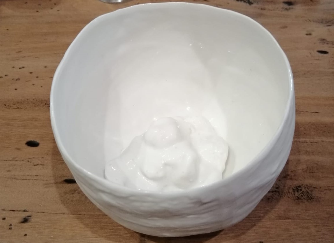 Igualmente raro se percibe el hecho de estructurar un plato que sirve casi para cerrar el menú sobre un simple cogollo de lechuga. El vegetal se presenta aliñado con vinagre de arroz y se acompaña con una quenelle de helado de nata. Caras de sorpresa se dibujan en el rostro de alguno de los comensales cuyo recorrido gastronómico no es exiguo, créanme. El mundo de los postres en la alta cocina en estas primeras décadas del siglo XXI se ha caracterizado por presentar una alternativa al dulce como única opción existente hasta entonces para cerrar un menú. Hemos probado postres que rezumaban acidez, con matices amargos, salinos incluso. Se ha combinado lo dulce con lo picante, pero este pase resulta difícilmente comparable a algo probado con anterioridad.