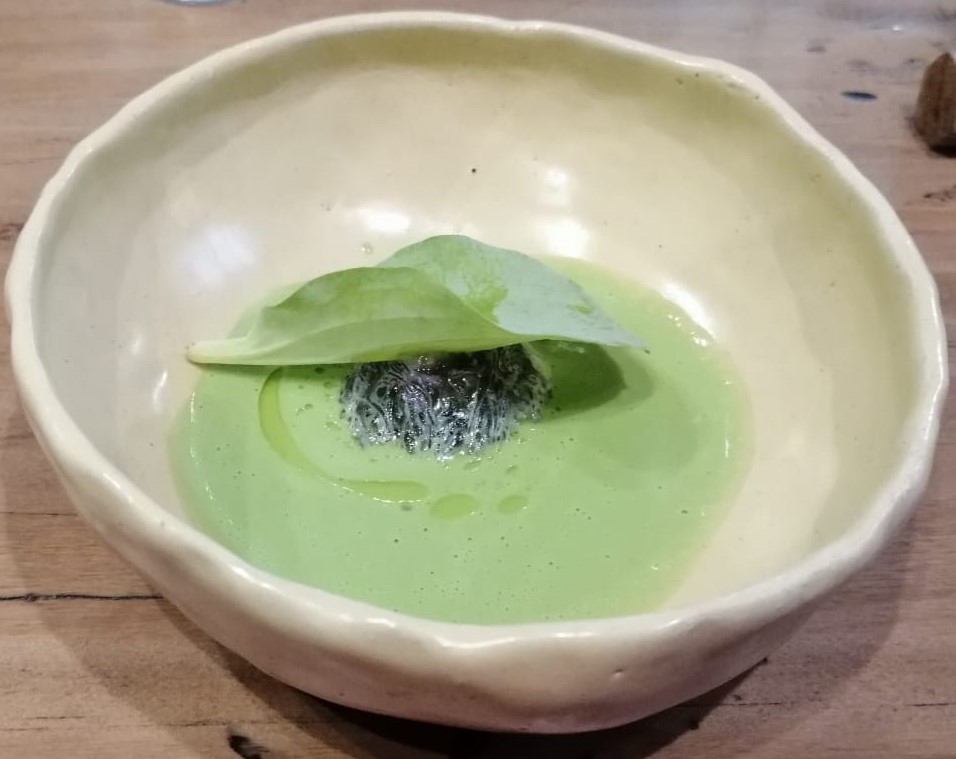La ortiga de mar evoca la salinidad y frescura de la cocina marina, cosa que, curiosamente se refuerza con un producto térreo. Se trata de la mertensia marítima u hoja de ostra que confiere al conjunto el mismo sabor que aportaría el molusco del cual hereda su nombre. A modo de intermedio, se sirve después un plato de cuchara en formato mini. Se trata de un agua de tomate con huevas de trucha. Pase sencillo antes de encarar la recta final.