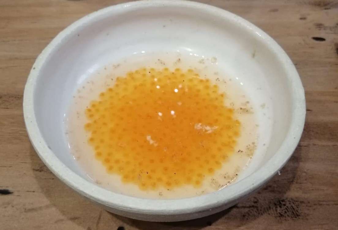 Para compensar el fuerte sabor del anterior plato, nos sacaron un agua templada de tomate, huevas de trucha y pimienta Sichuan ….