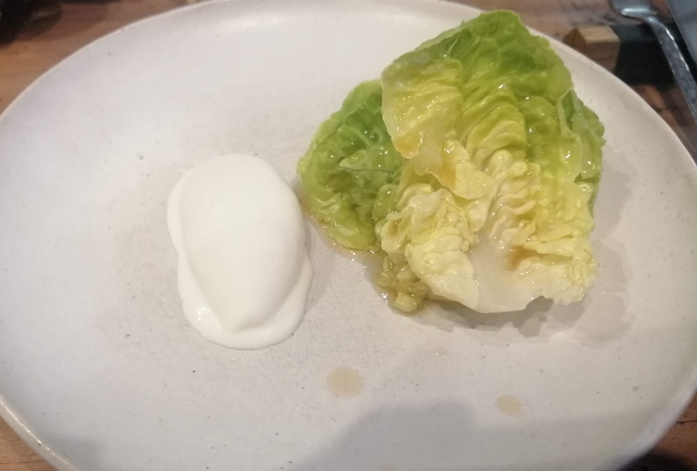 - Lechuga / nata doble / vinagre de arroz - Si alguien me hubiese dicho que me iba a gustar un postre con lechuga... Ni borracho... Pero sí, nos sorprendió y nos gustó muchísimo.