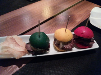* Trío de minihamburguesas. A descatar los panacillos de color amarillo, verde y rojo (la verdad es que el pan no era sabroso). Las hamburguesas sí que eran buenas: una con queso de cabra, la otra con "bolets" y la otra no la recuerdo