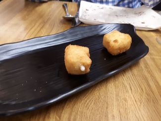 Como aperitivo de la casa, unas pequeñas croquetas de jamón, muy ricas, buena textura, antes habíamos un espumoso gallego (4€), hay me ganaron y copa de manzanilla (3,65€).