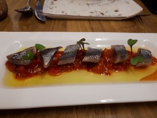 Unas sardinas ahumadas, sobre pimientos morones y brotes de mizuna, sencillo y sabroso, 7,8€.