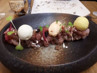 Tartar de atún rojo con helado de aceite de oliva, helado de tomate y helado de mostaza, polvo de aceite de oliva, patata morada encurtida y brotes de mostaza 19€, muy rico, un aporte distinto el de los helados al típico tartar, nos gusto.