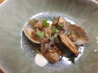 Fuera de carta, pedimos unas hermosas almejas con alcachofas, consomé de jamón y verduras, emulsión de coliflor y de nuevo brotes, estaban ricas, no había comido nunca esta combinación tierra-mar, 16€, nos pusieron un plato a cada uno, éramos dos, con dos ricas y hermosas almejas, como media alcachofa troceada y demás acompañamiento , buen producto , sin duda .