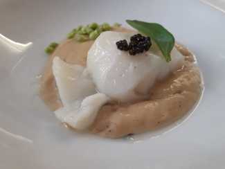 Sobre una crema de puerros, un buen trozo de bacalao confitado pasado por plancha, dos caviares, el “Per se Baerri” de esturión y otro, el verde de guisantes lagrima y la típica hoja de ostra, a nivel de todo el menú y acompañado por una malvasia de Sitges, Saserra 2014.