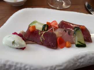 - Atún rojo en salazón ligera, mahonesa de ajo negro, encurtidos caseros y helado de wasabi: Se usa el atún Balfegó. Ante un producto de tal calidad, huelgan las elaboraciones complejas y los finos filetes (de lomo y de ventresca) se presentan sin cocinar. Los acompañantes hacen perfectamente su función, complementando sin neutralizar o ensombrecer el protagonismo de un atún excelso.