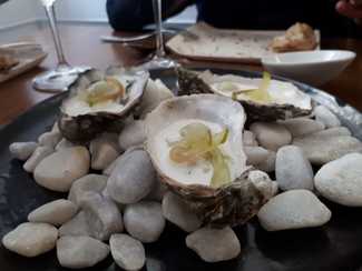 - Ostra de Iparralde, ajo blanco, apio y pepino. Mar y frescura con resultado exquisito.