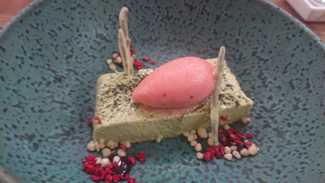 Pudin de queso con alga codium y plancton , peta zeta de chocolate blanco y helado de fresones , original propuesta , me gusto .