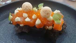 - Trucha del Pirineo marinada, ahumada y ligeramente escabechada sobre tosta de plancton de río, sus huevas y helado de tomate. Combinación estupenda que me gustó mucho.