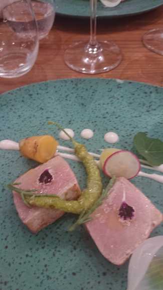 Atun Balfego a la brasa, ajo blanco de avellanas, puerro y cebolleta a la brasa , salicornias, piparras , oca de Peru , calidad a 28€ plato , dos platos para cuatro , picoteando ….