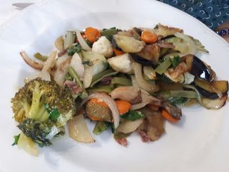 Ana , salteado de verduras, muy probablemente de la huerta que tienen , ricas , sabor a verdura , sin enmascaramientos y un punto de sal , soso , que se aprecie la mineralidad y el amargor de cada verdura como es , slow food .