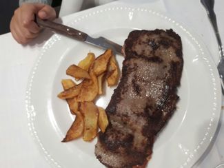 Uxue, escalope relleno de jamón y queso, tamaño cachopo, buena carne, rico jamón serrano, también york y buen queso, con unas ricas patatas fritas, a mi también me tocaron en mi plato, de esas que da gusto comer.