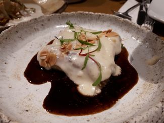 Empezamos con tres canelones de Pato con bechamel de trufa y su jugo, bien, bastante carne y la justa bechamel, rico, esto es media, 9€.