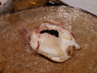 Un huevo de caserío frito, con velo de papada y caviar, 11€, cosa del caviar, imagino, solo unte una vez, era mas para mis chicas, no soy muy huevero.