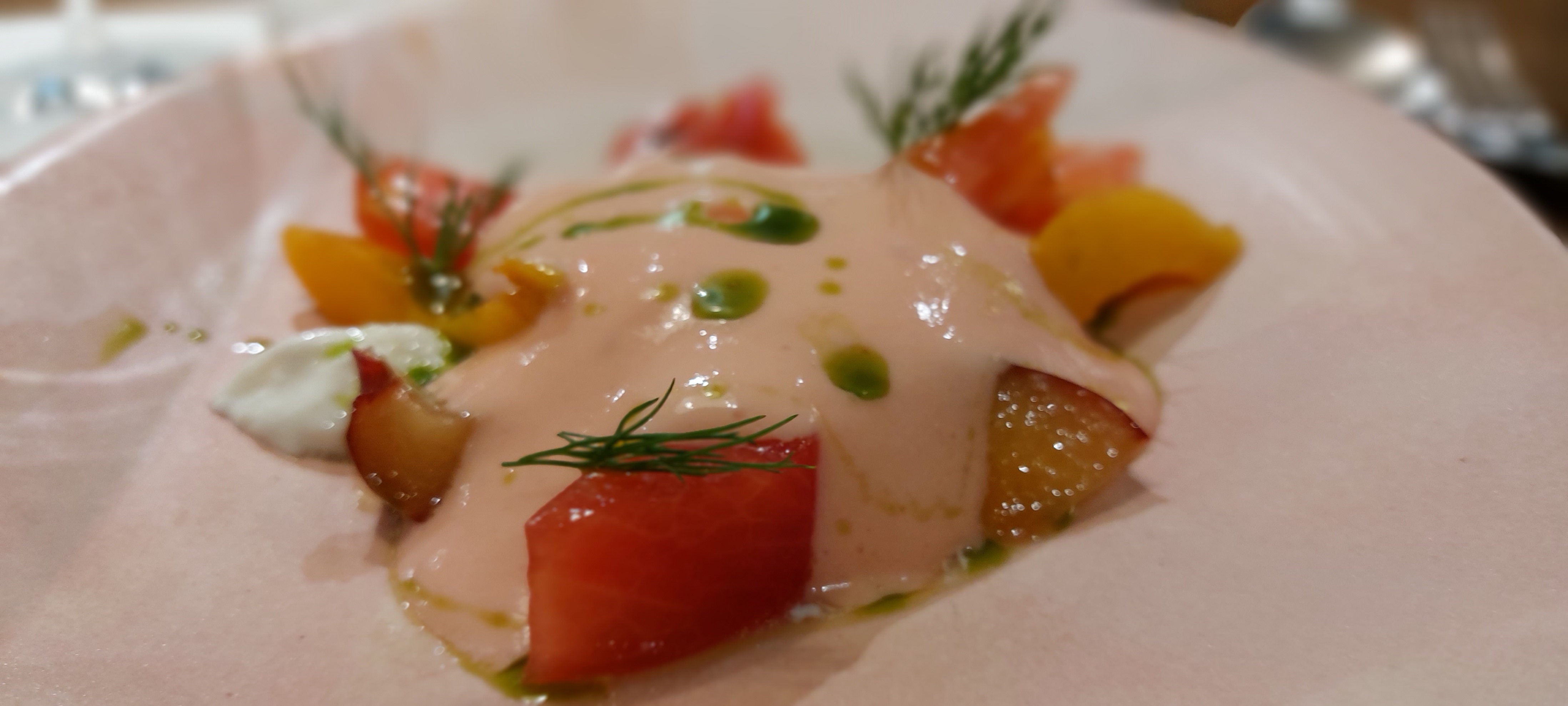 Ensalada de tomate valenciano, frutas y mouse de tomate y burrata, buen plato que aporta frescor al inicio de la cena.