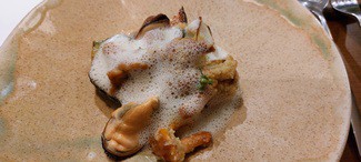 - Tartar de gambas, níscalos y tupinambo: aprovechando la época de setas, Toshi se saca de la manga una genialidad. La untuosidad y frescura del tartar combina a la perfección con el sabor térreo de los níscalos y con los toques peculiares del tupinambo que se sirve en dos cocciones: una crema que actúa como ligazón y unos chips fritos que aportan un toque crujiente y divertido. Para mí, un plato que, por sí solo, ya justifica la elección de este sitio como destino gastronómico.