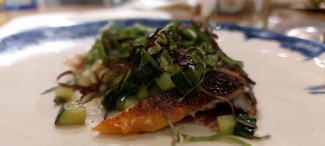 El bonito ha sido el pescado de elección en las tres ocasiones, aunque con preparaciones diferentes. En crudo a modo de tartar (con acompañamientos similares a una titaina), un semicrudo , apenas atemperado en la plancha con un acompañamiento de pepino y ajo negro y el que más me gustó, una cocción impecable en el kamado con un punto extraordinario y un jugo de pimiento rojo. Acompañamientos siempre acertados que suman.
