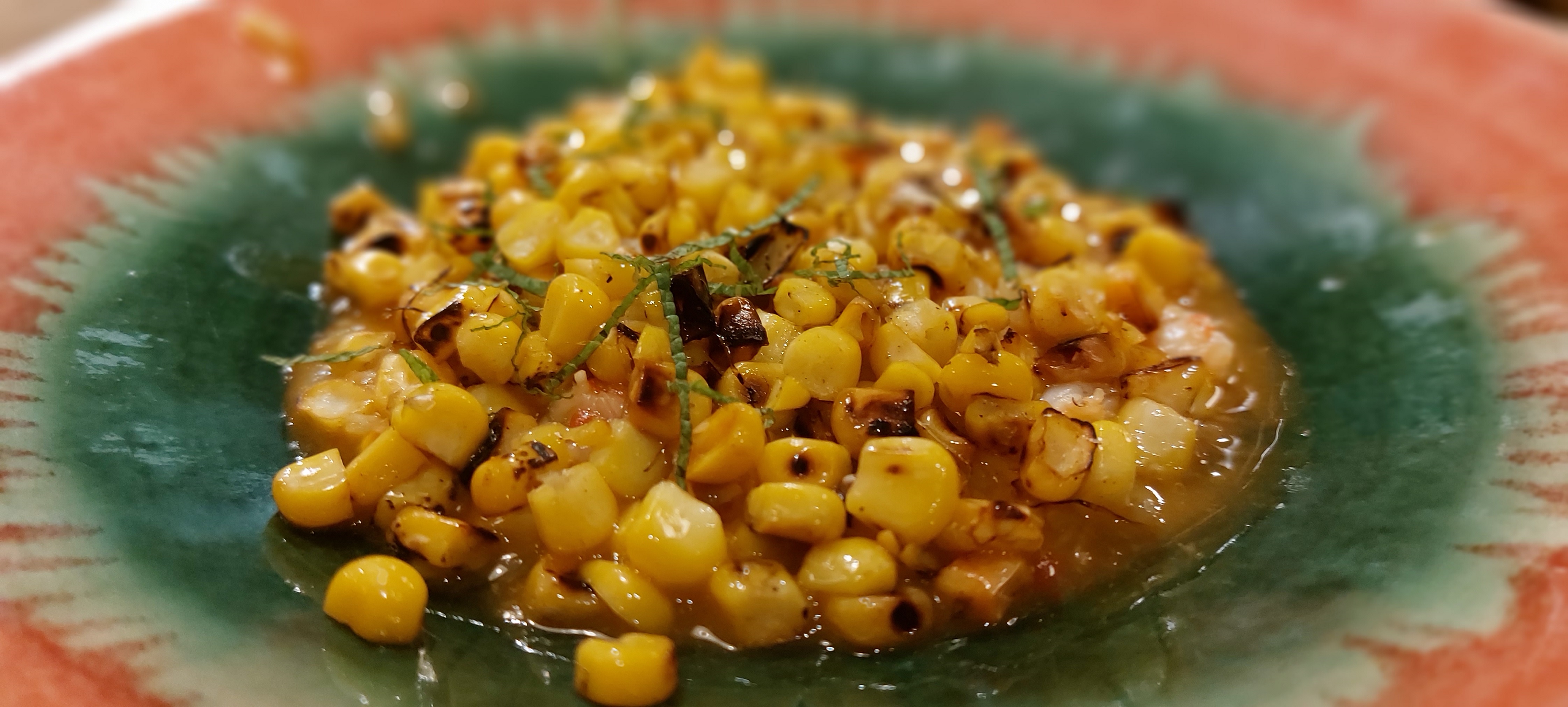 Arroz meloso con gamba roja y maíz tostado.- El nombre del plato debería ser maíz, arroz y gamba.