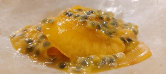 Melocotón y almendra con fruta de la pasión valenciano