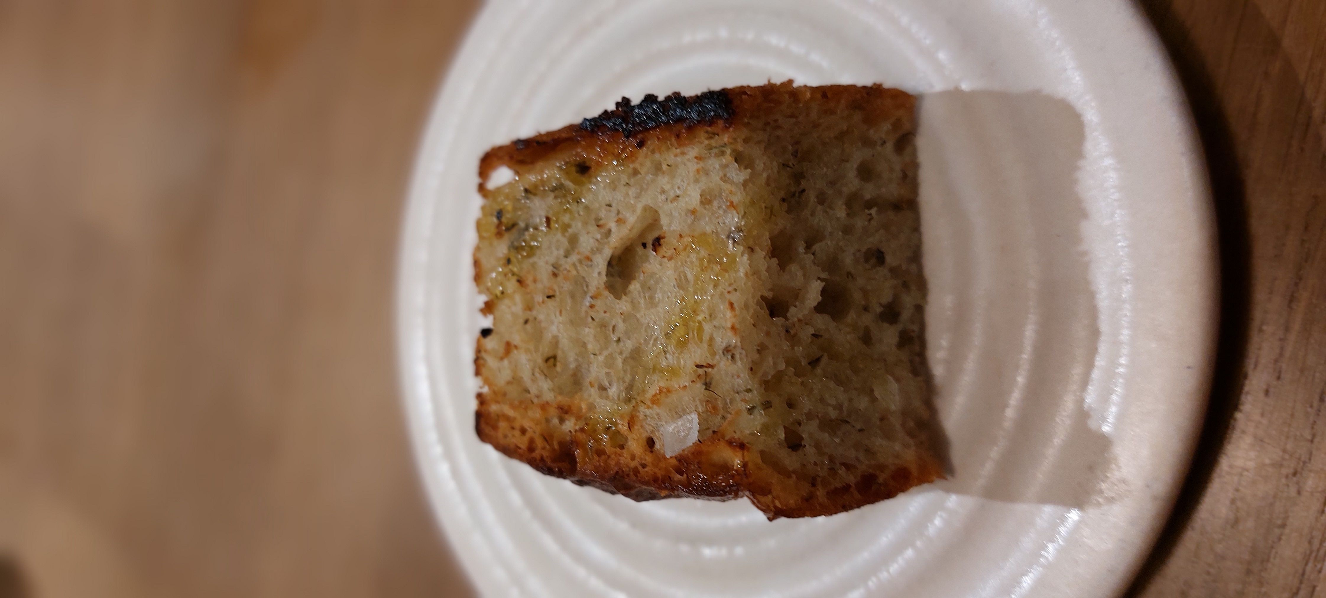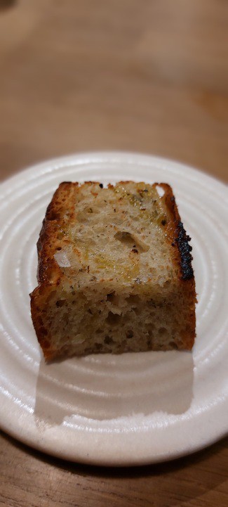 Acompañó la cena una focaccia de pan de hierbas pasado por plancha y ligeramente empapado en aceite que estaba de vicio