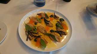 Jurel marinado en ponzu, con una emulsión de espirulina y codium rico, pocas veces se come esta preparación, que no resulte agradecida, si se tiene un mínimo de cuidado al ejecutarla, dos raciones a 14€.