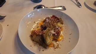 Alcachofas a la carbonara en brasa, copa de joselito, queso conté y trufa de otoño, la alcachofa, para mi, necesita un pelin mas de cocción, pero esto es cuestión de gustos, correcto, como dice Toni , tres raciones a 11€.