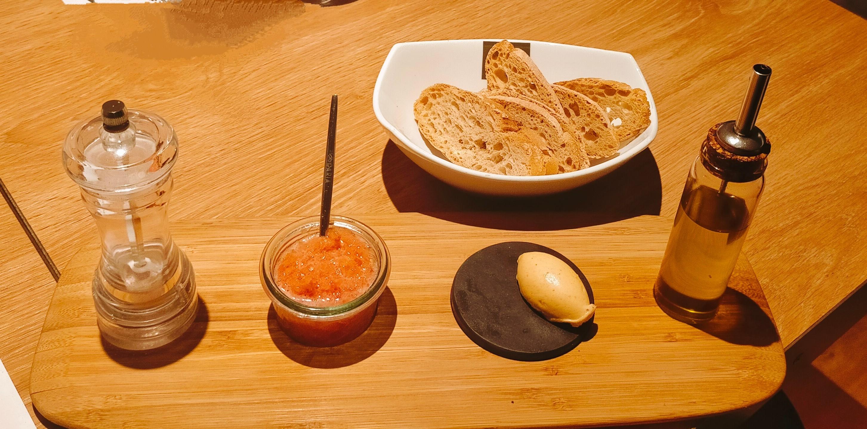 Mientras íbamos escogiendo nuestra cena, nos sirvieron un poco de tomate, AOV, sal, mantequilla y un buen pan de masa madre