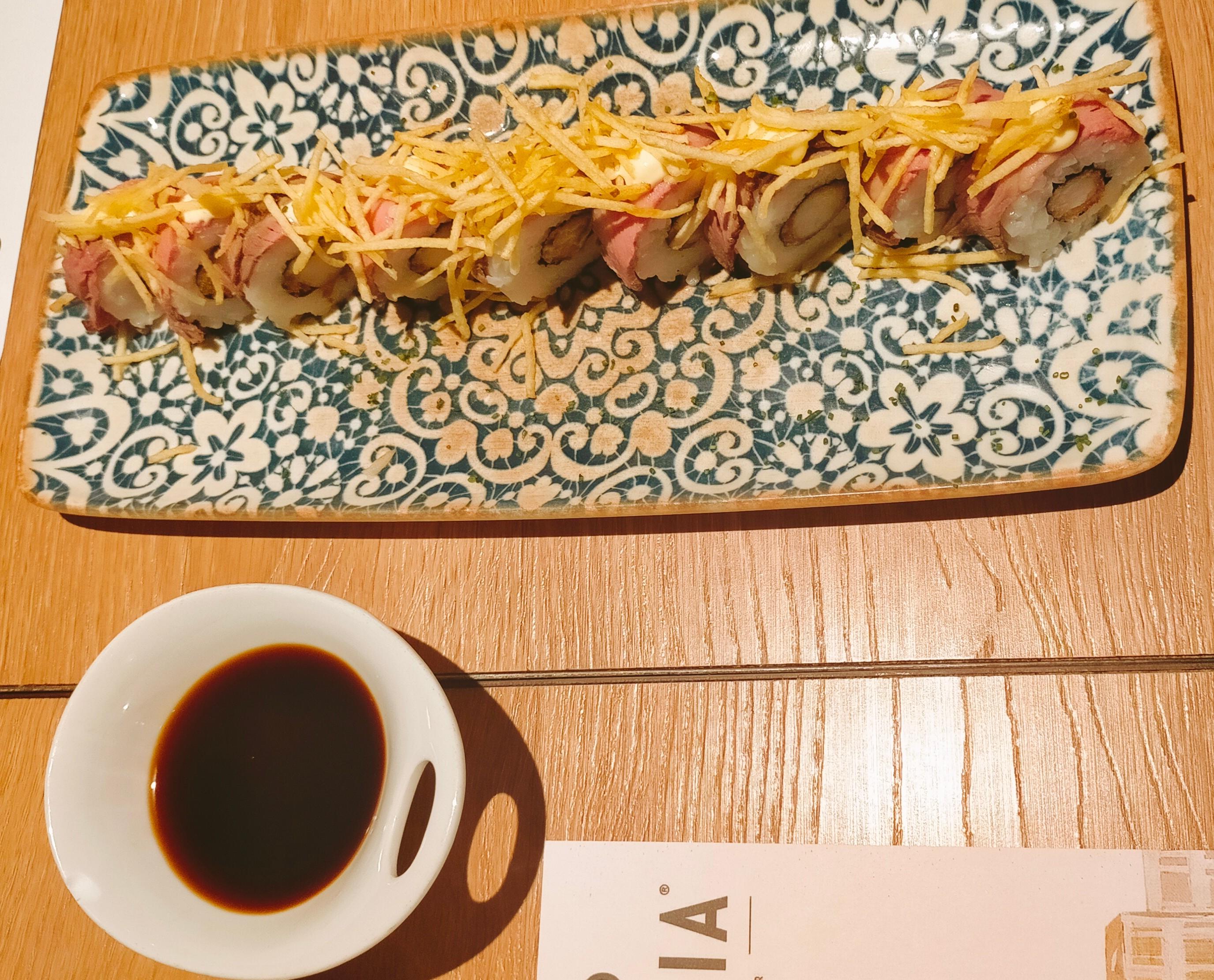 - Uramaki de mar y montaña (18 €) - Relleno de gambón rebozado y cubierto de roast beef, mahonesa y patatas paja. No encontré que la salsa de soja aportase nada bueno.