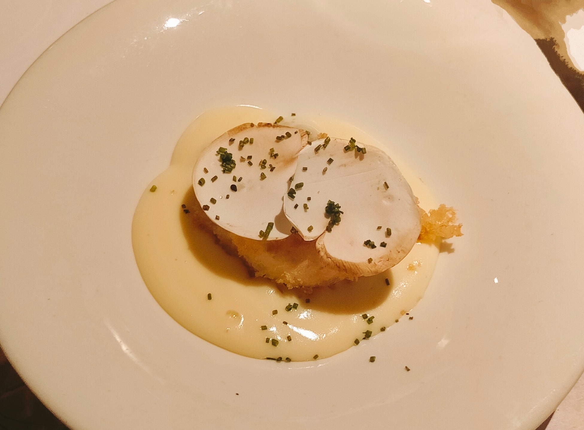 - Huevo frito crujiente (8 €) - El plato estrella de la casa. Algo similar a un huevo escalfado sobre una base de parmentier ligeramente trufada y duxelle de champiñones. Me hubiese gustado más si lo hubiesen cubierto con un par de lascas de trufa, en vez de las láminas de champiñón.