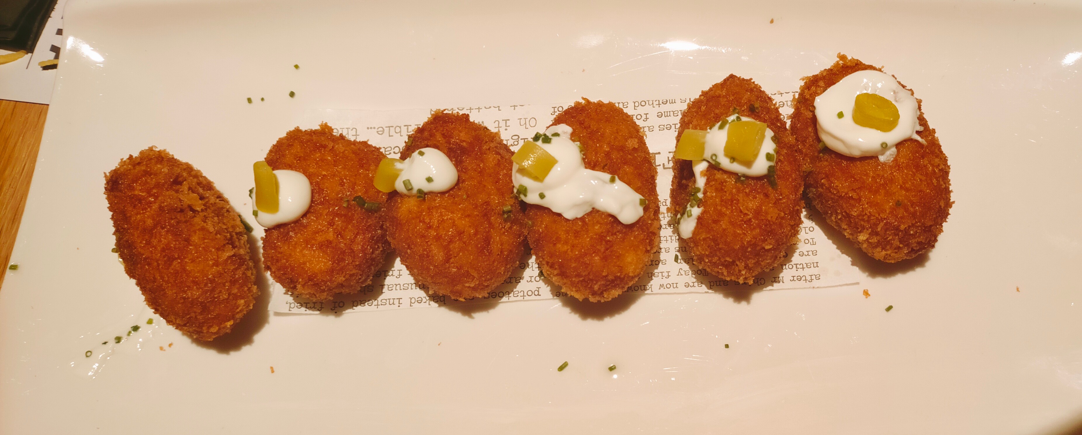 - Croquetas de chorizo picantonas (1,75 €/ud) - Cubiertas con yogur, cebollino y un trocito de piparra. Con el picante justo para nuestro gusto.
