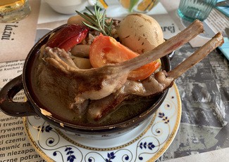 * Czulent dwa rodzaje miesa, serwowany z kotlecikami jagniecymi: Cordero con patatas, tomate, huevo duro y ternera estofada. Plato muy contundente y abundante.