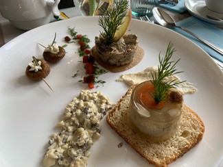* Fi giz kozim serem i rozmarymen , Tatar ze sledzia po zyowsku, Gefilte fish: Buen entrante con un tartar, geletina de pescado e higos con queso. Explosión de sabores y contrastes.