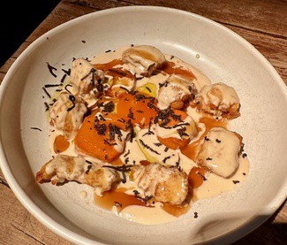 Restaurante que lleva tiempo de moda, hay que reservar con una cierta antelación. Público variado, con representación local y extranjera, edades diversas, fashion y no tanto,… Ambiente ruidoso, equipo de sala a menudo despistado. Precios relativamente altos pero algunos platos se pueden compartir porque son generosos. Se come bien, carta difícil de clasificar, pero, en general, de calidad y bien elaborada. Mesas despojadas y no observé una limpieza estricta cuando las preparaban para nuevos clientes. ¿Tan complicado es poner unos manteles, aunque sean sencillos, de papel? Compartimos tres platos. Unos cogollos con queso comté 24 meses muy buenos, unas alitas de pollo con yema de huevo, boniato y trufa sorprendentes que nos gustaron y, para acabar la clásica escalopa "san román" con huevo y trufa. Sin postre, copa de vino "Las Crestes" y el conocido café de infusión que no me convence. Una buena opción de cocina divertida y de calidad si no te importa el ambiente ruidoso y una cierta informalidad en el servicio de mesa y de sala.