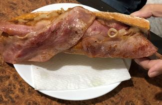 . pepito de bacon con patatas a lo pobre y longaniza: algo poco hecha la longaniza y bien el bacon.