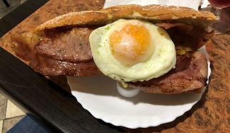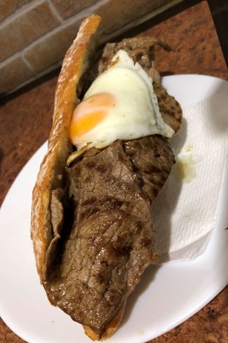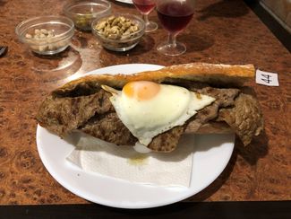 . pepito de bacon con patatas a lo pobre y huevo frito: nada que añadir a lo antes reseñado.