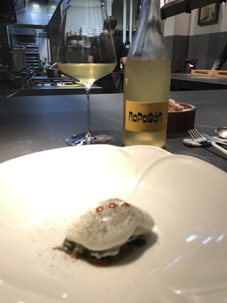 Cumple las expectativas, crudités de setas y toque de berenjena y almendra sureña, comiendo de todo a la vez. El vino Acompaña con notas oxidatvias ya aguantando acidez todavía. Bueno.