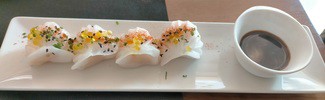 - Gyozas de langostino al vapor con esferas de aceite (8,00 €) - Se notaba el langostino. Muy buenas incluso sin la salsa.