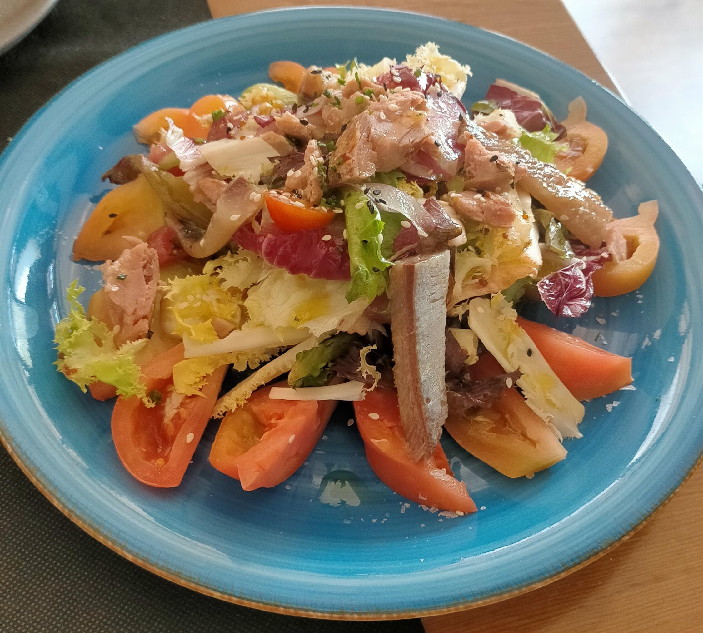 - Ensalada con tomate, cebolla morada, sardina ahumada, atún en texturas y