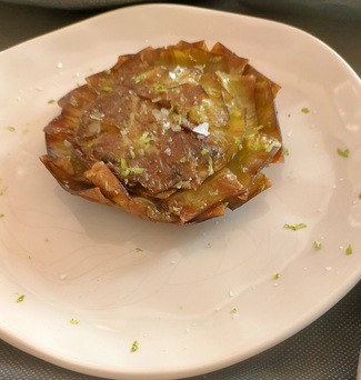 - Alcachofa confitada y a la plancha con sal maldon y lima (3,00 €) - A mi mujer le encantó.