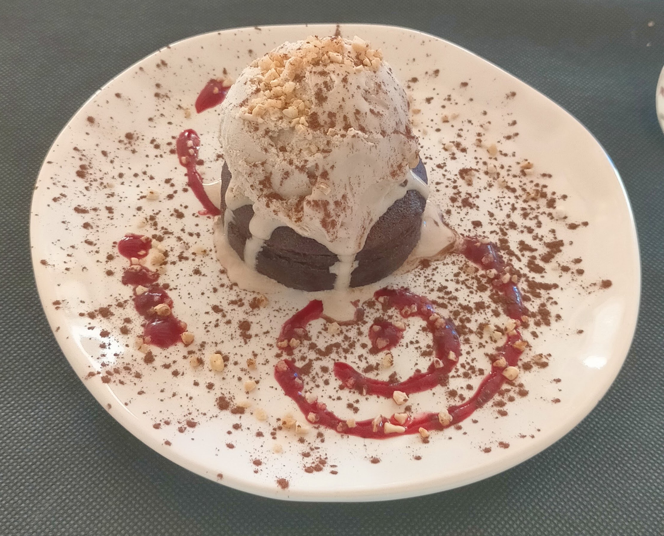 - Coulant con helado de avellana (6,50 €) - Me lo sirvieron tal cual está en la foto, con el helado encima. Lógicamente, el coulant se solidificó. Solicité que me lo cambiasen y me lo trajeron con el helado al lado del coulant. Para olvidar.