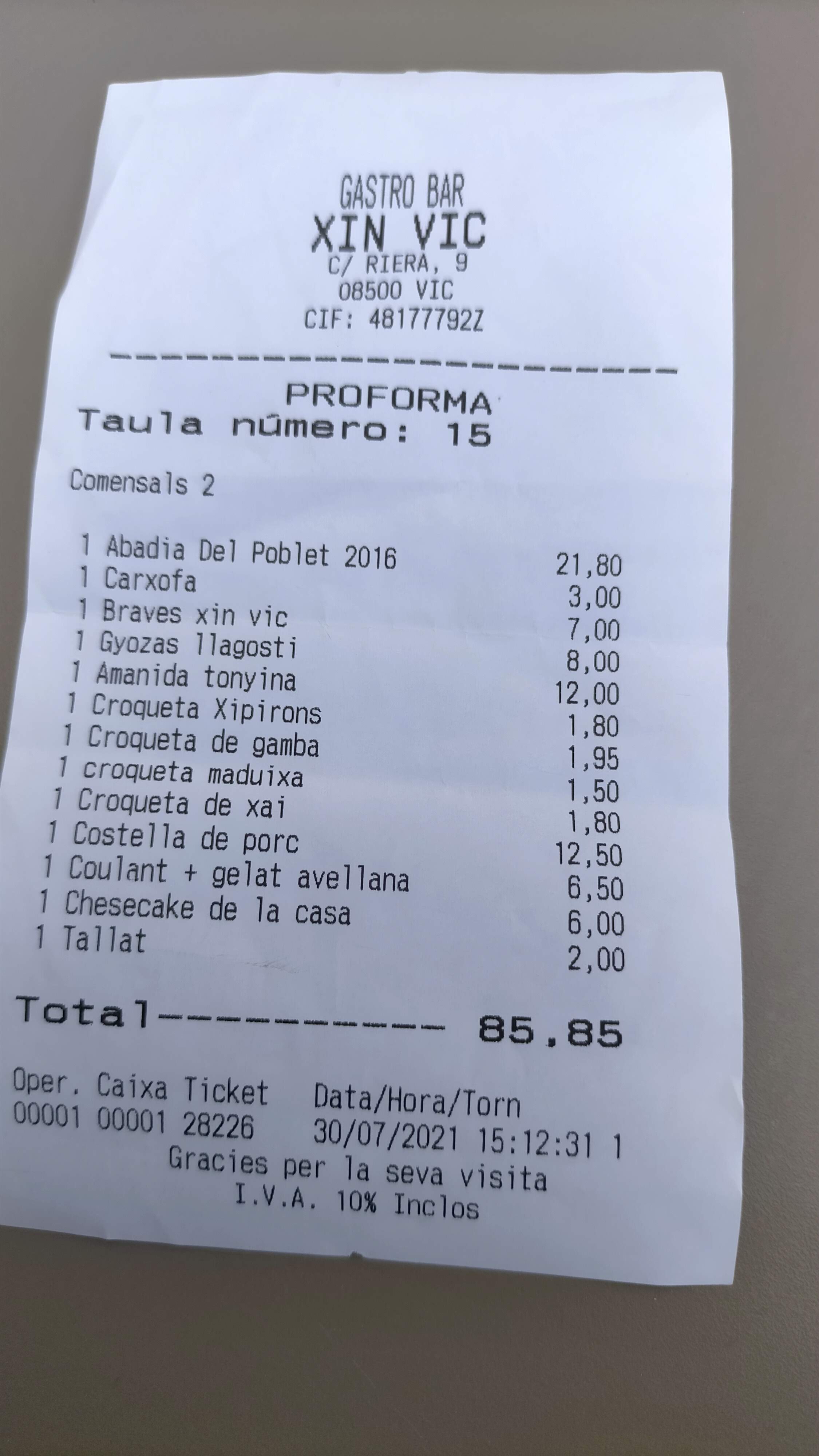 Carta a base de pequeñas raciones con un toque moderno. Carta de vinos escueta con referencias de gama más bien baja y solo una añada, que además era incorrecta. Precios por debajo de x1,5. Copas correctas. Servicio consistente en apertura y primer llenado.