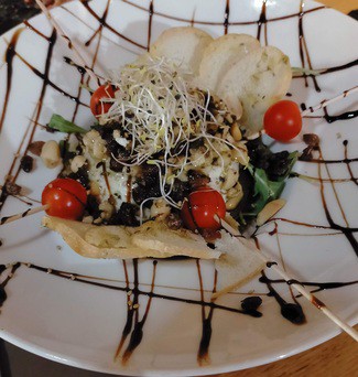 - Amanida de formatge burrata amb ruca, pinxos de tomàquet, pesto d'alfàbrega i nous (8,20 €) - Igual la presentació és una mica barroca, però l'amanida ens agradà força.