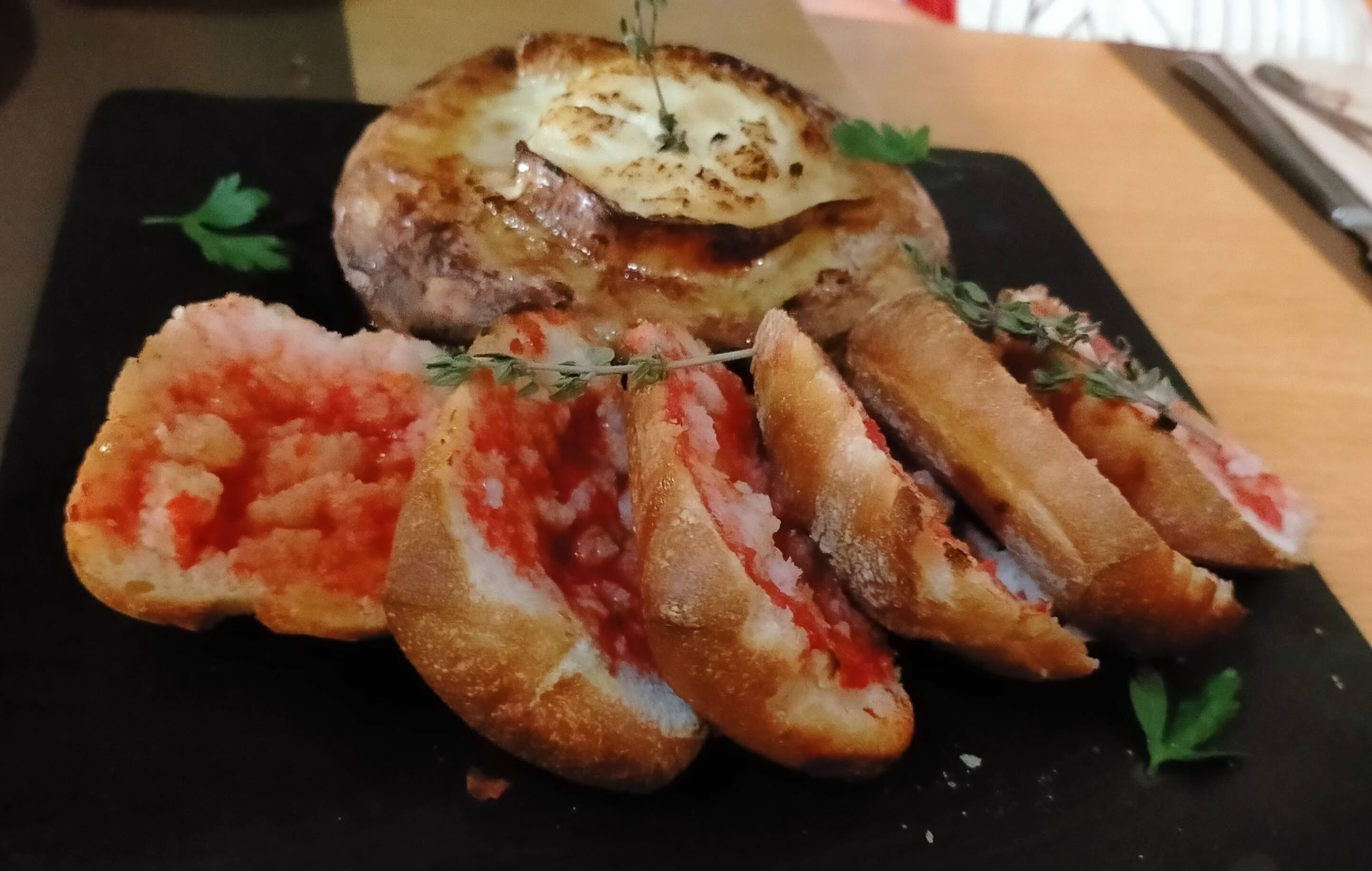 - Truita de patates amb formatge de cabra i ceba trufada sobre pa amb tomàquet (9,50 €) - Tret que la truita estava al costat del pa, i no a sobre, molt i molt bona. Jo vaig tastar un tros sense formatge. El pa amb tomàquet, de lo milloret que he tastat fa temps.