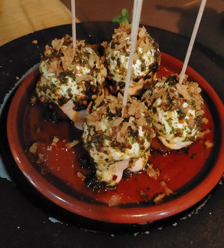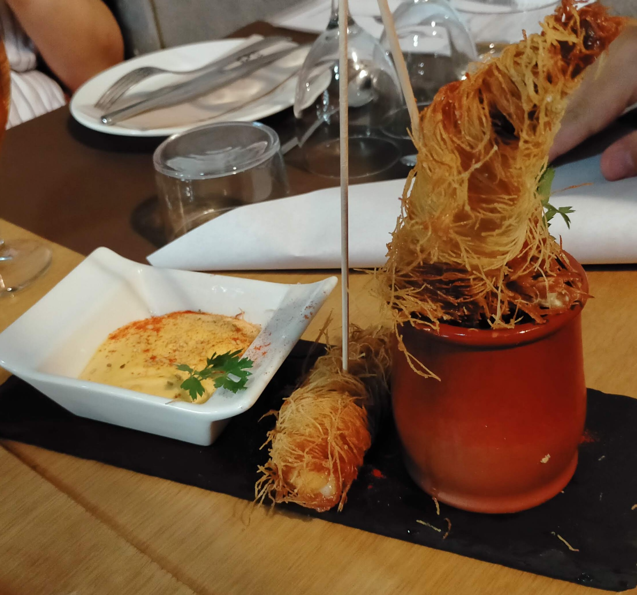 - Gambes de costa embolcallades de pasta kataifi cruixent i salsa mil illes (9 €) - 3 llagostins congelats de bona mida (per aqueix preu, no es pot esperar res millor) ben arrebossats i amb una salsa deliciosa que se'ns va fer curta.