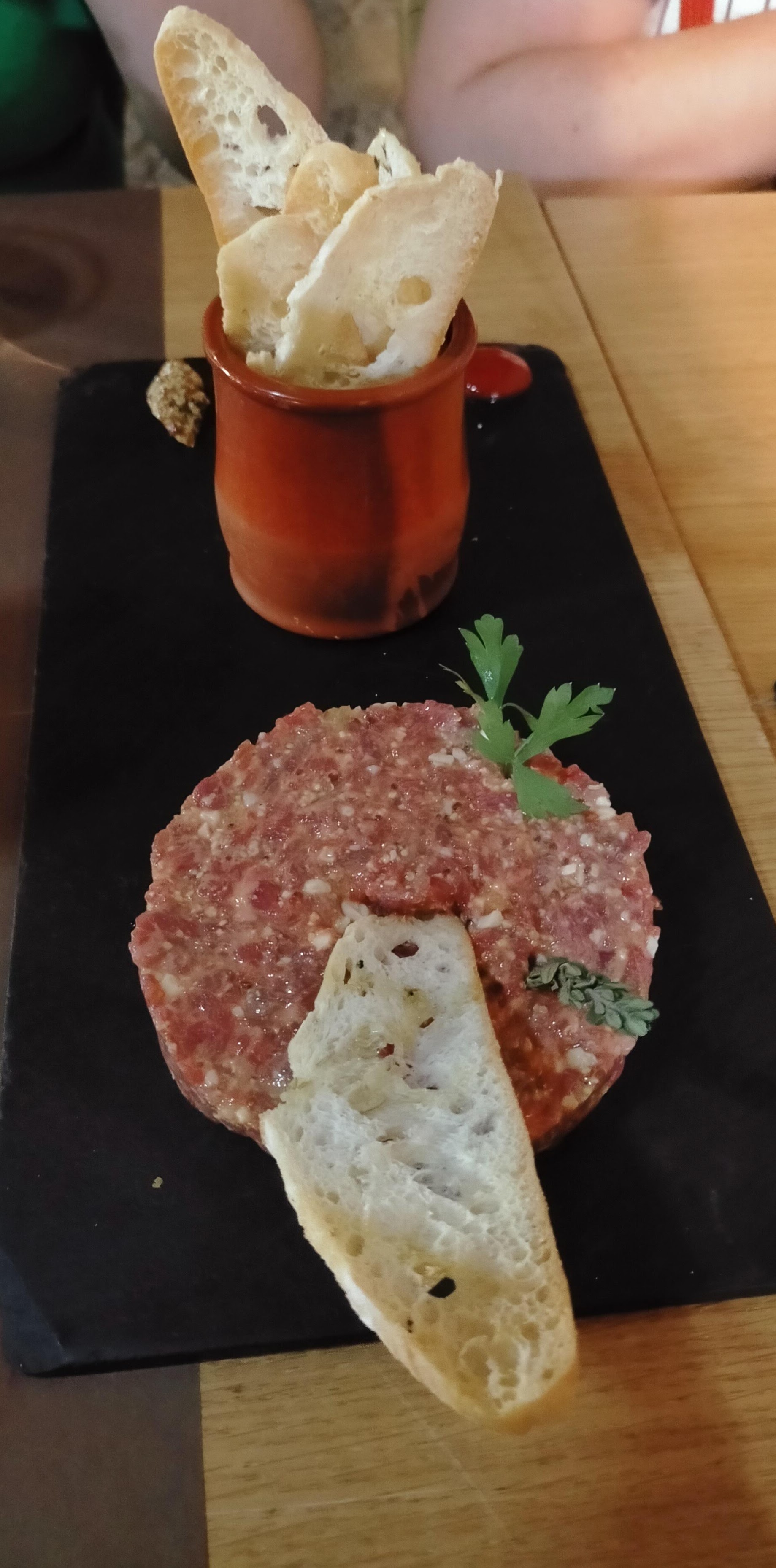 - Steak tartar de vedella a l'estil 8de7 amb torradetes cruixents de coca i el seu trio de salses (8,50 €) - Molt gustós. Les salses, tot i agradar-nos, les vam trobar prescindibles.