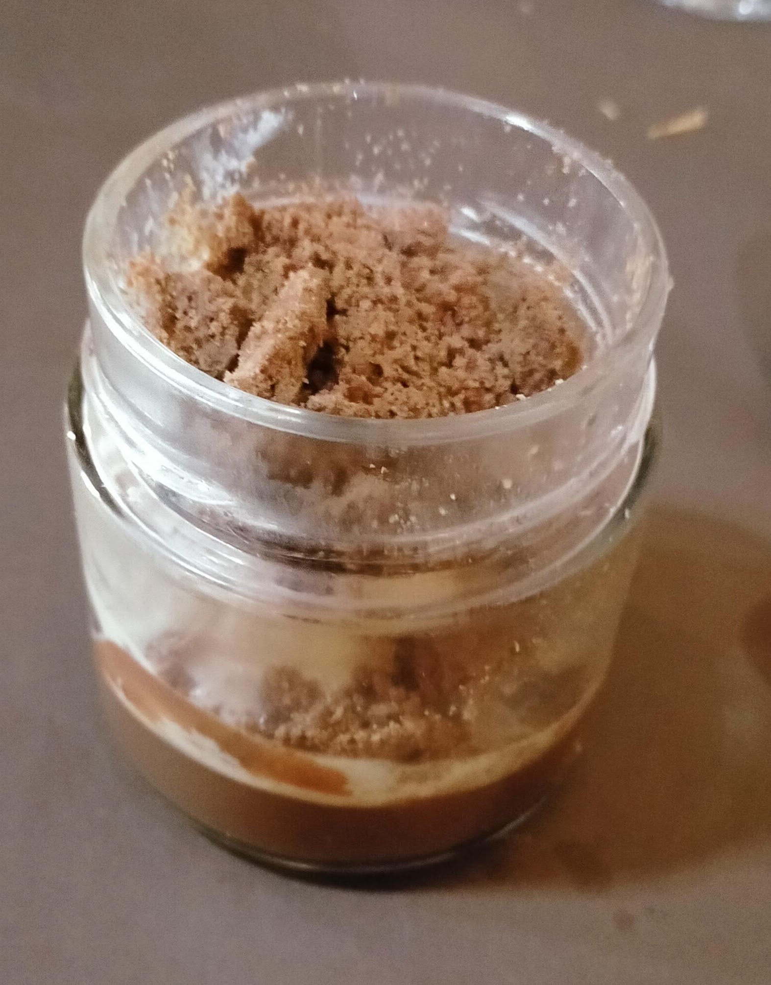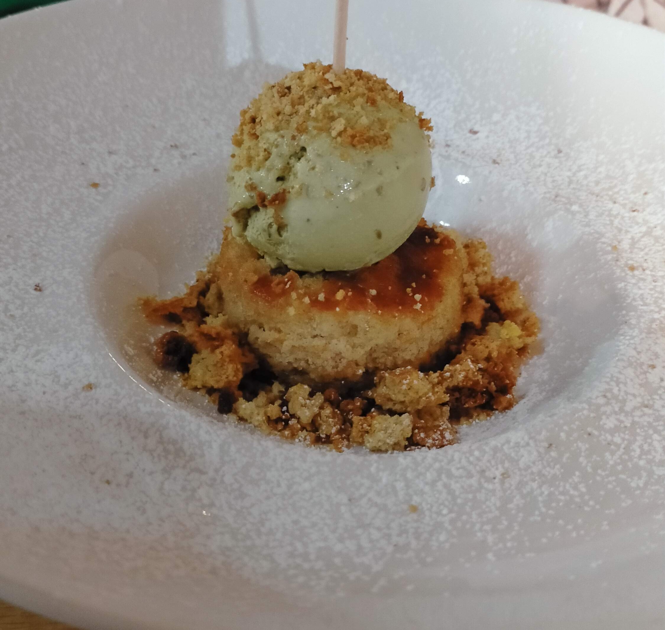 - Pastís d'ametlla i pastanaga infusionat amb licor de poma sobre esfera gelada de festucs (4,50 €) - Va agradar prou.